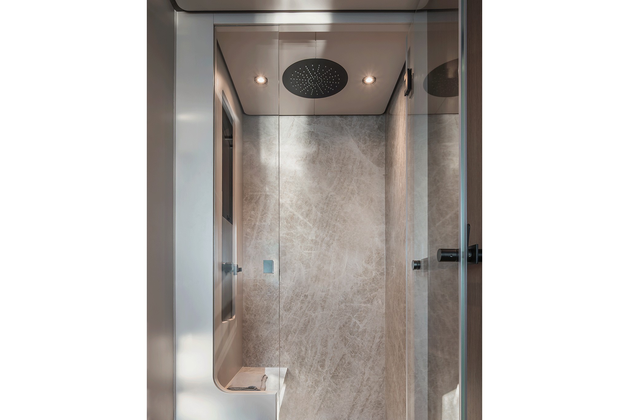 Das Lichtdesign ist ein Alleinstellungsmerkmal der 720. Horizontale LEDs, die in die Decken integriert sind, erzeugen einen weichen, streuenden Effekt, während unabhängige vertikale Strahler mit verstellbaren Lichtkegeln originelle Details mit szenischem Flair hervorheben. All das ergibt ein erhabenes Erlebnis von Stil und Komfort.
